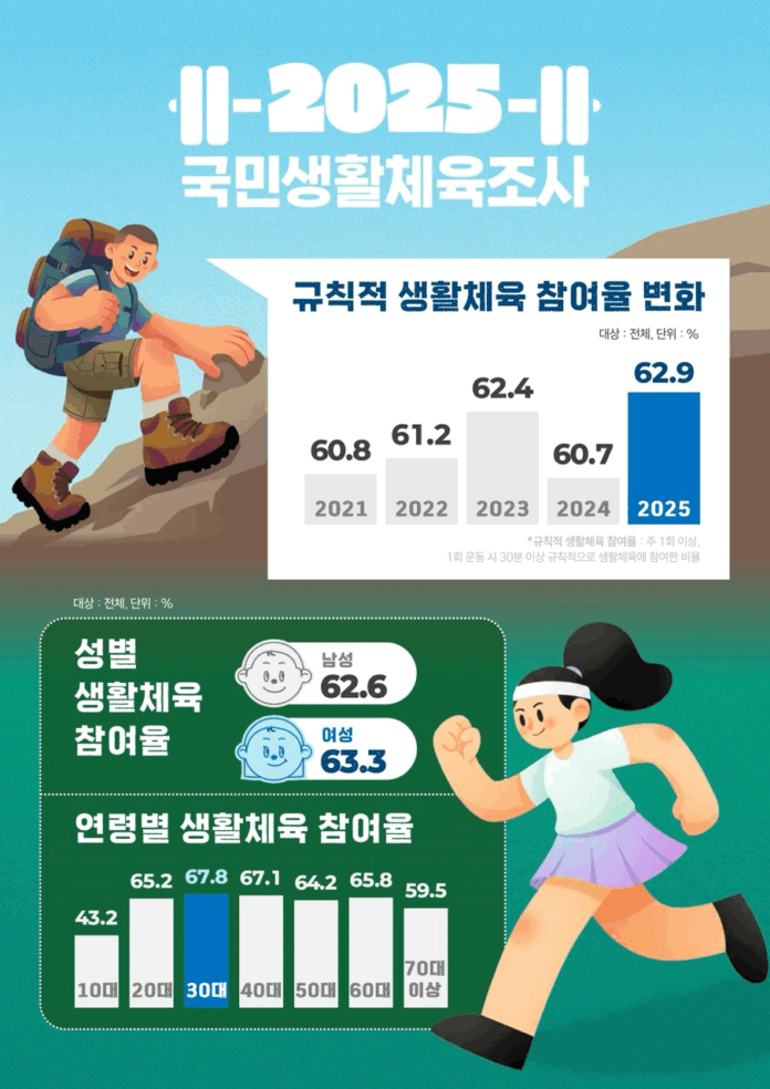 문화체육관광부(장관 최휘영, 이하 문체부)는 만 10세 이상인 국민 9천 명을 대상으로 시행한 ‘2025년 국민생활체육조사*’ 결과를 발표했다.