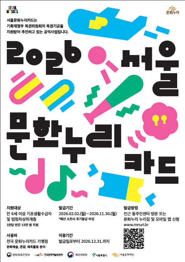 서울문화재단(대표이사 송형종)은 기초생활수급자와 차상위 계층의 문화 향유 기회를 확대하기 위해 문화누리카드 지원금을 전년 대비 1만 원 늘려 연간 15만 원으로 인상하고, 올해 카드 발급과 사용을 시작했다고 밝혔다.